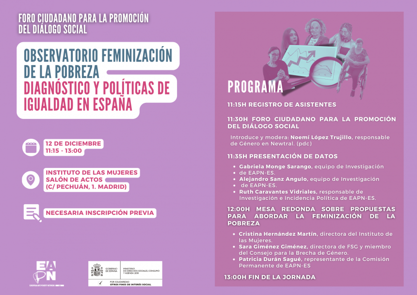 El viernes 12 de diciembre, EAPN-ES organiza en formato semipresencial en el Instituto de las Mujeres (Salón de actos. C/ Pechuán, 1. Madrid) el Foro Ciudadano para la promoción del dialogo social, en horario de 11:15 a 13:00 horas.